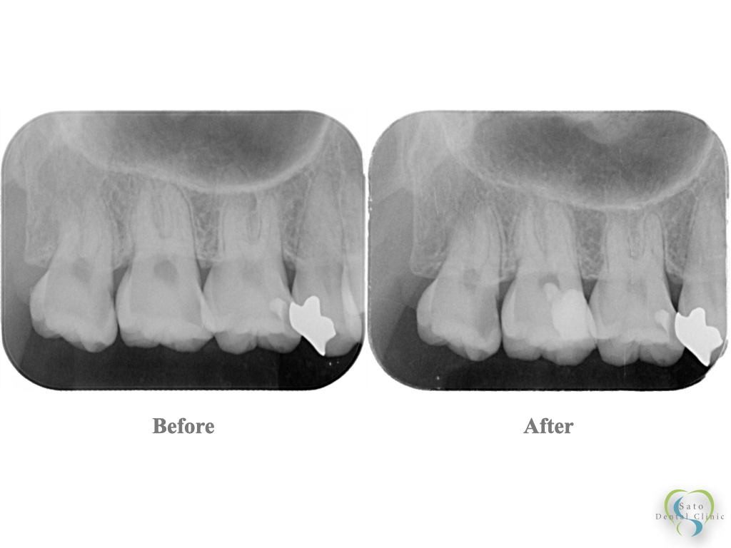 治療前のレントゲンでは、歯髄に近接した大きなむし歯が確認できます。