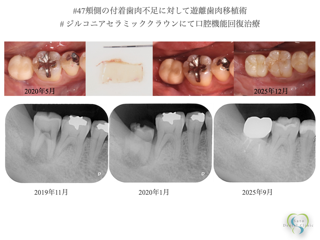 さらに、付着歯肉不足に対して遊離歯肉移植術(FGG)を併用し、歯周組織の安定を図っています。